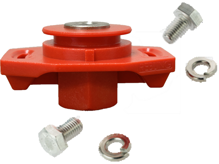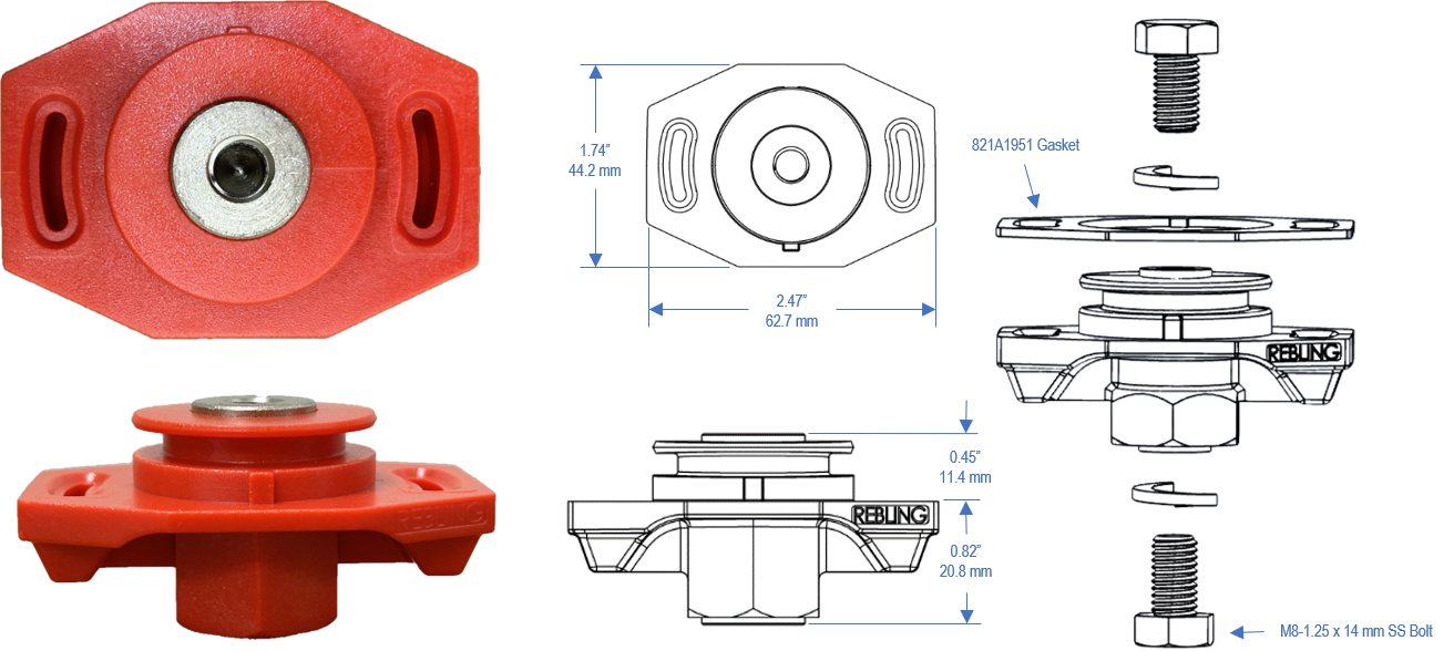 The Top Seal Terminal saves the OEM $15 of material and labor on each battery produced and reduces each battery's volume by 200 cc. The Top Seal eliminates 20 inches (500 mm) of cable + 4 crimp lugs + production labor from each battery. The Top Seal is designed for OEMs transitioning from manufacturing hundreds of batteries annually to scaling up to production levels ranging from tens of thousands to hundreds of thousands per year. Our 500 amp Top Seal Terminal uses the same nickel-plated brass conductor, accepts the same rigid and flexible covers, and has the same performance characteristics as Rebling’s 500 amp MFT-style feed-through terminal. This terminal is intended for lithium battery OEMs which are packaging their cell packs inside molded plastic or aluminum cases that are 1 to 20 times the size of an automotive starter battery. The Top Seal Terminal enables the OEM to attach the terminal to the lithium cell pack first, place the cell pack into the battery case, place the lid onto the battery case (allowing the terminals to poke through clearance holes in the lid), attach the lid to the terminals with flat-head sheet metal screws then screw, glue or weld the battery lid to the battery case. The Top Seal Terminal reduces the amount of labor and eliminates two cables which the OEM previously used to attach the terminals. The “Arc of Forgiveness” feature allows the terminal to be mis-rotated by 30 degrees and still align with the screw holes in the battery lid. It also includes an “Orientation Key” feature which high precision OEMs can use to aid in alignment.