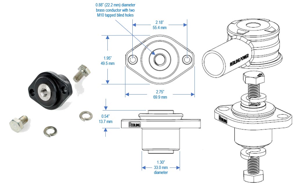 Our 750 amp XFT-style terminal (with mounting ears) has performance characteristics identical to our BFT-style 750 amp terminal but is specially designed for mounting onto thin or weak panels. The XFT-style 750 amp terminal’s nickel-plated brass core stays cool at 750 amps of continuous current or for short term peaks of 4,000 amps. These terminals are designed for the temperature-sensitive environment of lithium battery cells and the charging rates of ultracapacitors and supercapacitors. Equipping your power module with these watertight, single-pole, wrench disconnect, brass battery terminals will facilitate the incorporation of your modules into cutting edge GenSet, APU, or Vehicle Electrification systems.